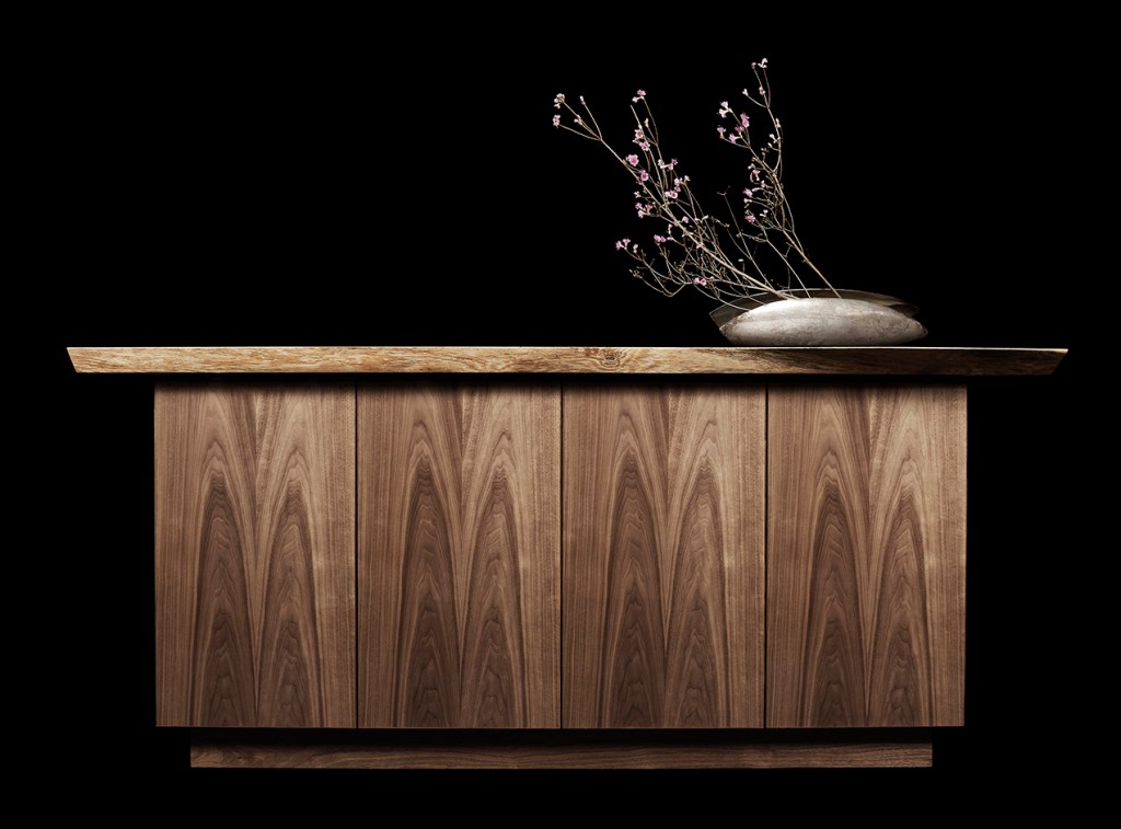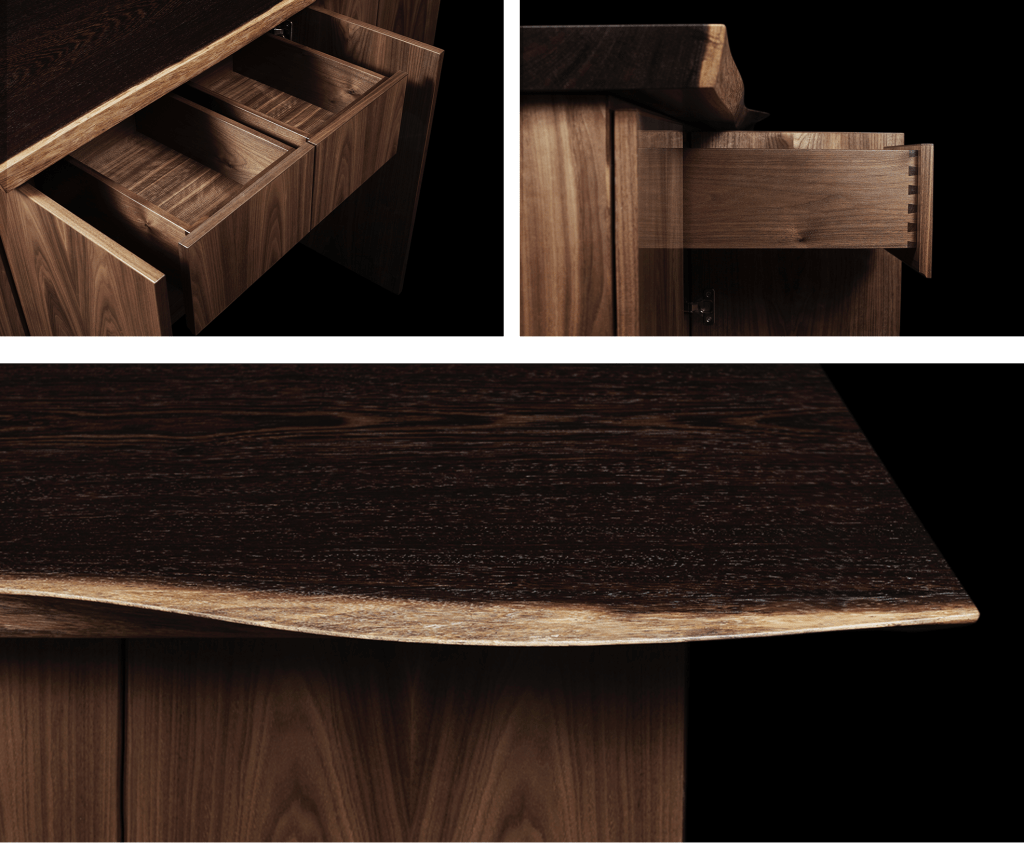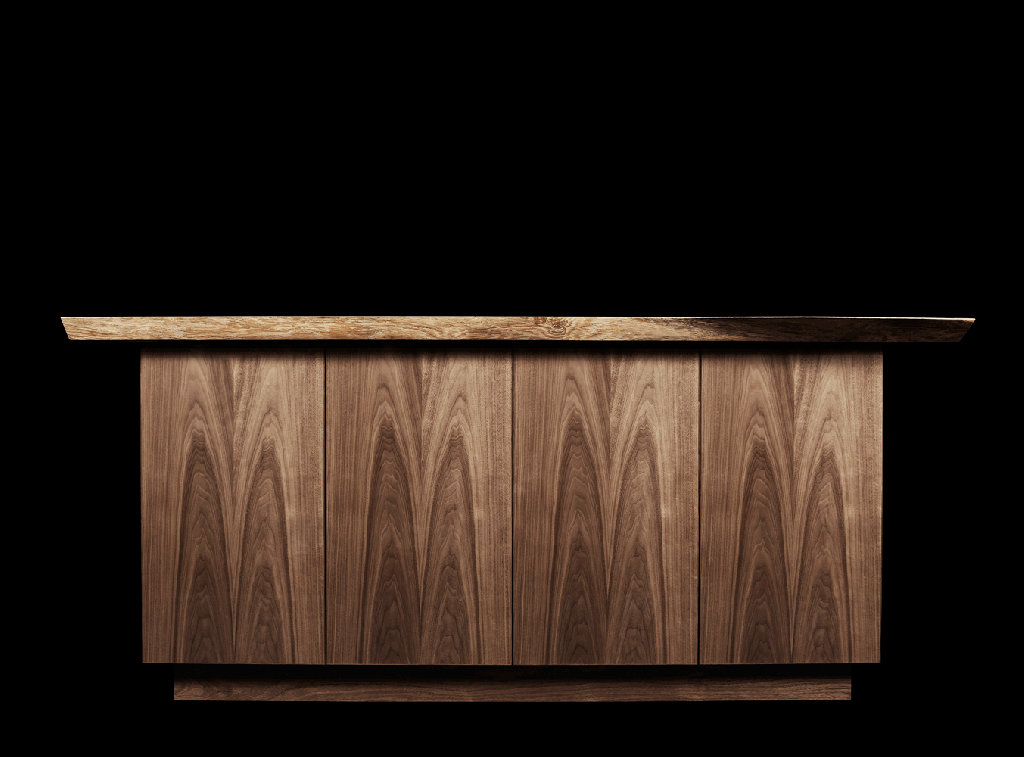 A custom credenza with classic detail but contemporary presence was designed and built for a Hong Kong high rise apartment. The aesthetic of this piece of furniture is restrained and its understated beauty shines in the luster and texture of the dark hardwoods of which it was made. Wood grains are carefully selected in dovetailed and book matched alignments. Upon opening the cabinet doors, its functionality is revealed with hidden under mount drawers and self closing hardware.