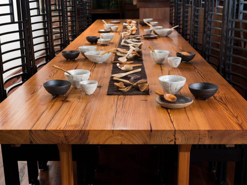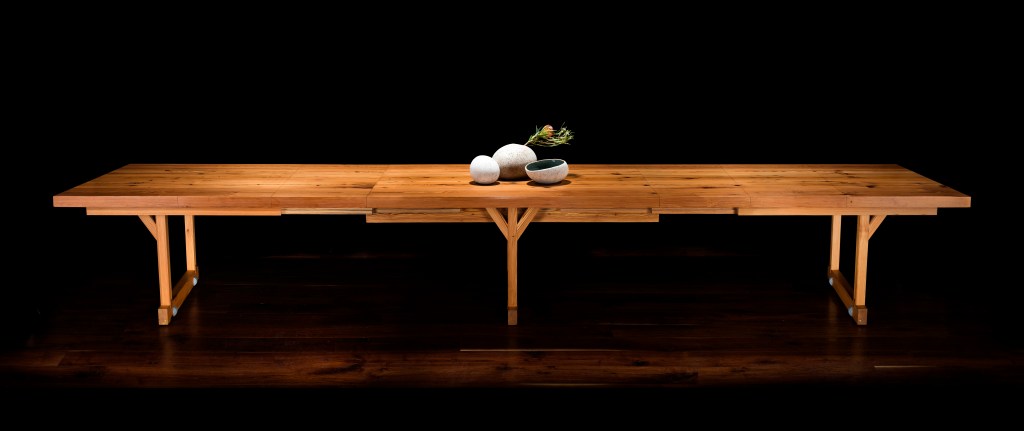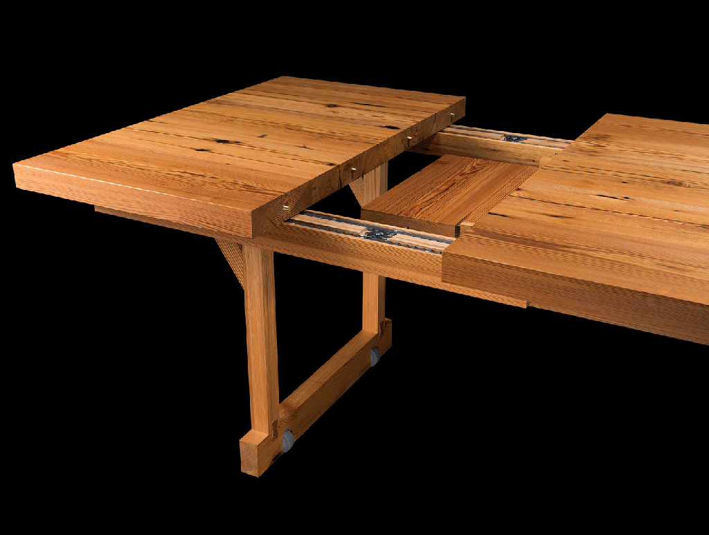Five Southern Longleaf Pine beams were used to construct this table. The old growth full length beams were salvaged and reclaimed from a demolished factory building from the 19th century in Brooklyn, NY and were refinished and repurposed carefully to minimize waste and to reveal the continuity of the grain patterns along their length, unfolding their storied histories. The table can transform from the intimate scale of a family dinner to accommodating 24 guests for a culinary feast.
