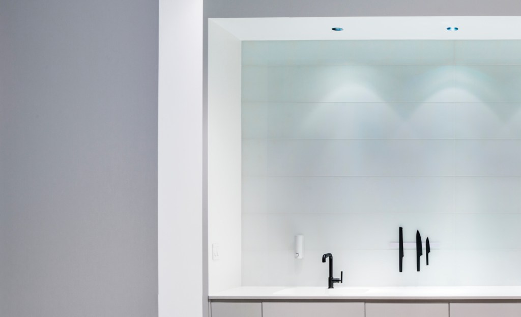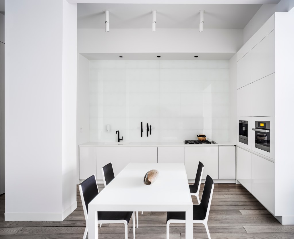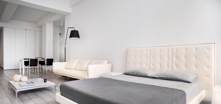 This minimalist loft apartment overlooking the East River is defined by contrasts in black and white and subtle details. Designed as a pied-à-terre for a graphic designer based overseas, the 750-square-foot loft with 11.5-foot ceilings is carved out of a former factory and school building. Juxtaposed monochromatic textures and materials come together in carefully designed details.